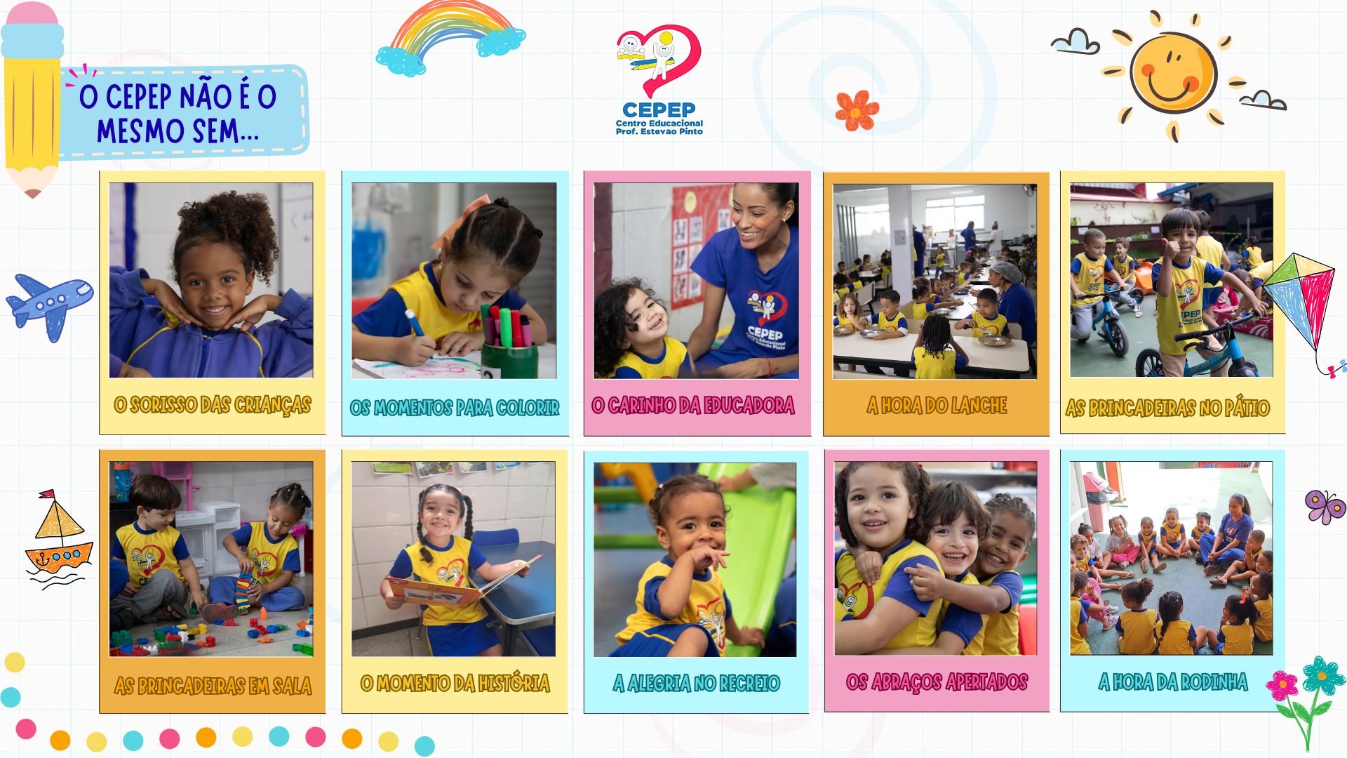 O CEPEP cria condições para o desenvolvimento cognitivo, físico, simbólico, social e emocional da criança.